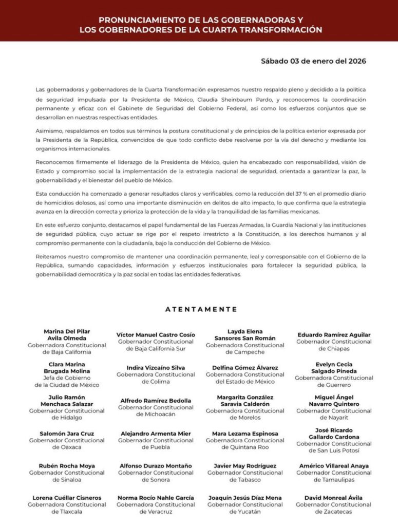 El posicionamiento fue dado a conocer el sábado 3 de enero de 2026, en un documento firmado de manera conjunta por mandatarias y mandatarios estatales afines al proyecto de la 4T, donde se enfatiza la coordinación entre los gobiernos estatales y el Gobierno Federal para garantizar la paz, la gobernabilidad y el bienestar social.