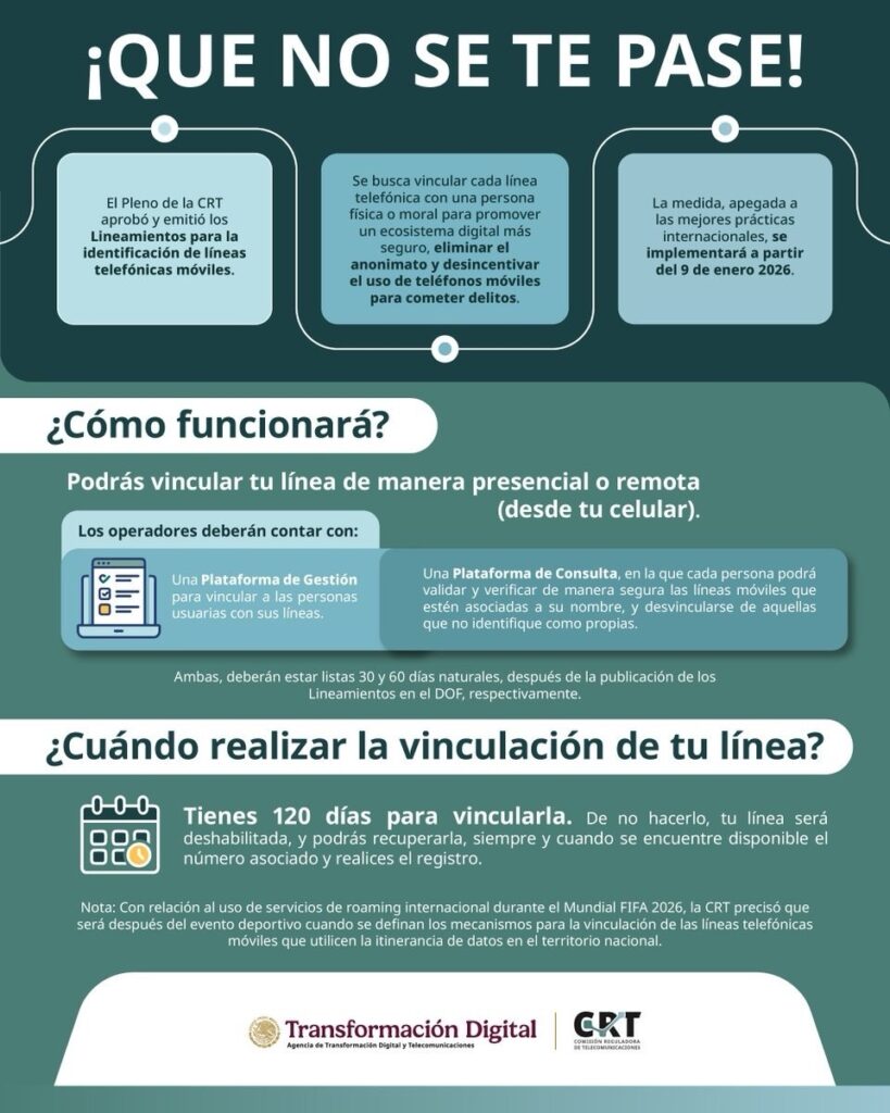 A partir del 9 de enero de 2026, todos los usuarios de telefonía móvil en México deberán registrar su línea telefónica con su CURP como parte de la implementación del Padrón Nacional de Usuarios de Telefonía Móvil, una medida impulsada para combatir delitos como la extorsión, el fraude telefónico y el secuestro virtual.