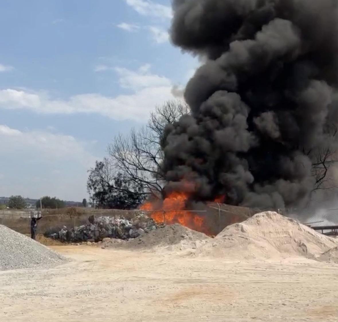 El siniestro ocurrió sobre la avenida Ojo de Agua, a un costado del bajo puente que cruza la Autopista México-Pachuca, en las inmediaciones del fraccionamiento Real del Cid. De acuerdo con los primeros reportes, el fuego comenzó dentro del predio donde se almacenaban grandes cantidades de material reciclable como plástico, PET, cartón y llantas.